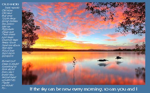 Burned out? Deep in doubt? Something to think about: Every day’s brand-new. Second-hand wouldn’t do. Maybe we should try... IF THE SKY CAN BE NEW EVERY MORNING, SO CAN YOU AND I
