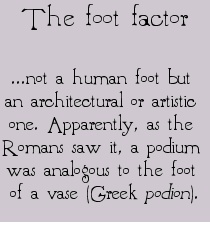 Norman French invaded England in 1066. The army—led by the Duke of Normandy (who was about to become King William I of England)—mopped the floor with weary English foot soldiers at the Battle of Hastings in 1066. In the aftermath, Normans and their families arrived in great waves, bringing their culture, their customs, and their language. Podiums not yet being in use, podium wasn't part of the initial inundation. The podium | podiums – foot | feet connection What, precisely, do podium and foot have in common? I guess I always assumed, without giving it much thought, that the podium got its name because people stand on it. You know, with their feet. But that's not it at all—though it's a useful way to remember the difference. The "foot" in this equation isn't a human foot but an architectural or artistic one, as illustrated above ("the Foot Factor"). Apparently the Romans, who invented and named the podium, thought it resembled the foot of a vase (Greek podion). If you have one podium and you get a second one, then you have two podiums. Podia is acceptable, in a pinkie-finger sort of way. If you say podia, I guarantee, people will smirk when your back is turned. Me, I'm a Nebraska girl. I don't say celli or concerti or podia or gymnasia, I don't eat raw fish, and I never pay retail. |