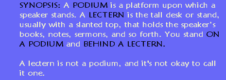 lectern, or (b) Lectern is yesterday's soggy Rice Krispies. It's been written out of The West Wing and drop-kicked out of our lives. If it were a lame horse it would be taken out and shot, and We the Righteous are going to have to suck it up... unless... Hey! You guys wouldn't want to join me in putting our collective foot down and making a stand for standing on (not at or behind) a podium, would you? Email mary@annagrammatica.com for a list of public officials and prominent educators to contact, starting with the Secretary-General of the United Nations. The man conducts his entire life behind a lectern. Okay, maybe it's not a global hot button, but the podium | lectern controversy isn’t just about little me with a bug in my brassiere. The experts and scholars are unanimous in their assent: A lectern isn’t a podium and it’s not okay to call it one. Here’s a heartening comment from a Toastmaster, followed by another from an authority on public speaking: A podium is a platform upon which a speaker stands while speaking. If that sounds like a stage, you are correct. It is like a stage. A podium can have a lectern on it, [as]... can a stage. You could have a lectern on a podium on a stage. A speaker stands on a podium. —Message Masters Toastmasters http://messagemasters.squarespace.com/articles/what-is-a-lectern- or-podium.html