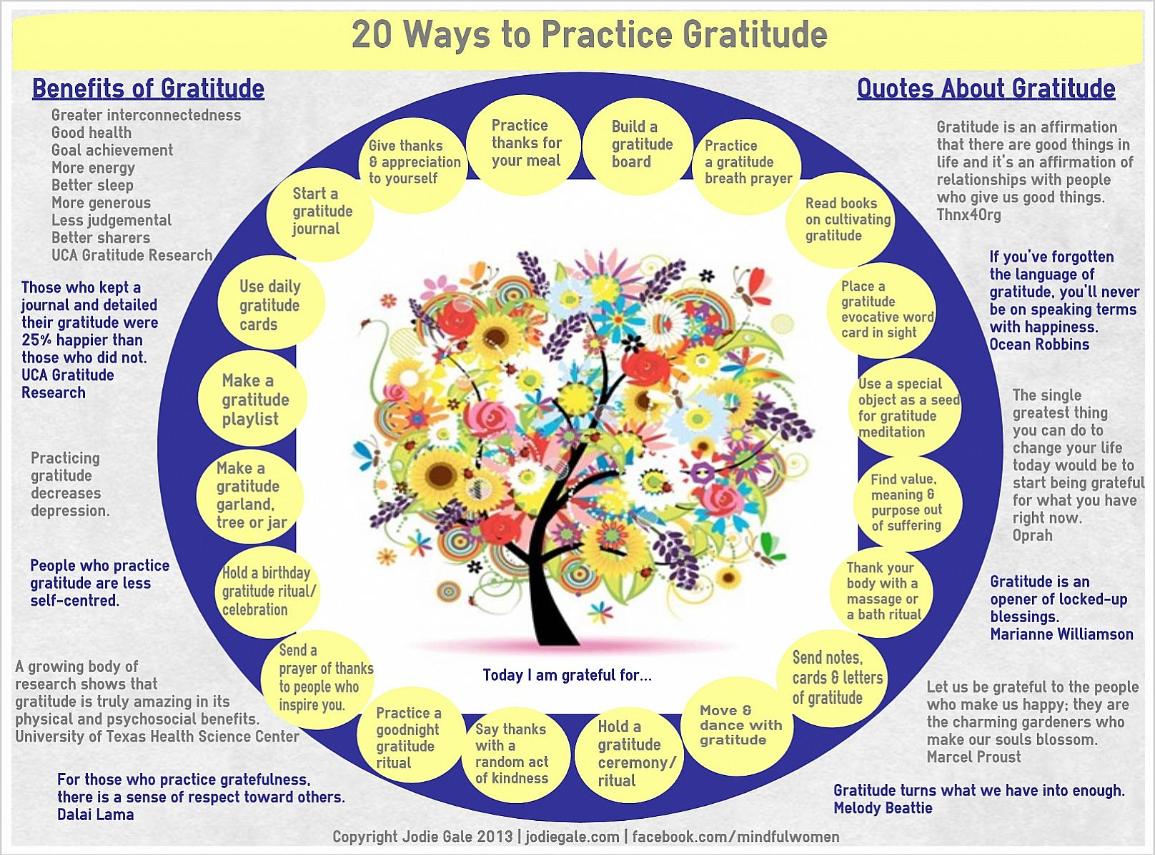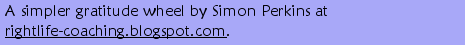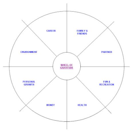 ‘gratitude rock’, carry it with you along with your keys and wallet. The idea is to remember and say “Thank You” for something in your life, each time you touch or see the rock.... An actual rock is not necessary. My mother uses a cute little keychain as her gratitude rock. Gratitude beads. Collect a short string of unique beads, and give significance to each one. As you run your fingers through them, with each bead, think of one thing you are grateful for. If you use beads in this way, gratitude can be a bridge to meditation and peace. At bedtime... running my fingers over gratitude beads allows me to focus on my many wonders and blessings as I go to sleep. Wheel of gratitude. Use this tool to make a mental map of who and what you are grateful for in your life. Simon Perkins’ blog offers this technique as part of his mission to, “help everyday individuals cut through our self-imposed limitations and start enjoying life.” This is a compact display of all the richness in your life (and it fits neatly inside the cover of your Gratitude Journal). |